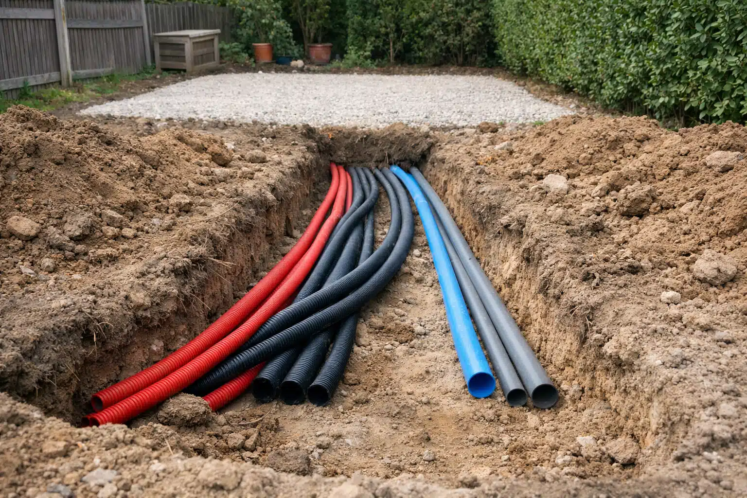 Après le creusement, procédez à la pose des gaines et canalisations avant de couler la dalle si votre abri en nécessite une. Les fourreaux peuvent traverser la dalle, évitant ainsi de percer ultérieurement. Si l’abri repose sur des plots ou longrines, faites émerger les réseaux à l’emplacement précis prévu pour les branchements intérieurs.